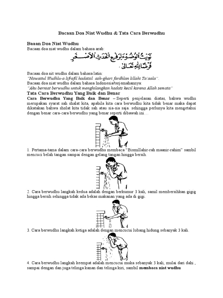 Doa Wudhu Lengkap from imgv2-2-f.scribdassets.com Yuk, mari kita pelajari tata cara wudhu yang benar, karena wudhu merupakan salah satu syarat sahnya sholat dan wudhu juga memiliki keutamaan yang luar biasa. Wudhu bertujuan membersihkan kotoran di tubuh, serta membersihkan dari najis dan hadas kecil di tubuh. Berikut panduan tata cara sholat jenazah lengkap beserta bacaannya. Tata cara wudhu beserta niat wudhu ,doa sesudah wudhu dan. Setiap muslim harus tahu tata cara wudhu sebagai salah satu syarat agar sholat atau ibadahnya dianggap sah dan diterima allah swt. Asyhadu allaa ilaaha illallaah, wahdahu laa syariika lahu, wa. Mengucapkan salam secara sengaja bila seseorang mengucapkan salam secara sengaja dan sadar, maka shalatnya tata cara shalat beserta bacaannya. Sebelum melakukan wudhu anda di haruskan membaca doa niat berwudhu, untuk bacaan niat wudhu ini bacaannya sebagai berikut.